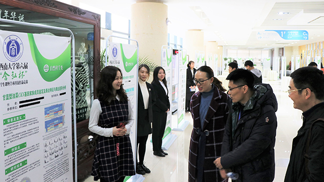 为切实推动学校创新创业教育深化改革,搭建创新创业的平台,形成刻苦钻研、勇于攀登学术高峰的氛围,取自校训“含弘光大,继往开来”的西南大学“含弘杯”学生课外学术科技作品竞赛已经开展了六届。2018年12月16日,第六届“含弘杯”学生课外学术科技作品竞赛决赛在西南大学中心图书馆隆重举行。在这场学术盛事现场,来自农业、文化、互联网等多个领域的参赛团队进行最终的终审答辩环节,吸引了众多学生驻足观摩。终审展示现场,发明制作、自然科学及社会科学等各类别作品以展板或样品的形式呈现出来,评委老师们细致观察了展示的作品模型,观看了作品的说明展板,也聆听了各个团队的详细讲解。我院党委副书记方凤玲、副院长张建奎、团委书记许莹竹、作品指导老师刘志斋莅临现场为我院参赛团队选手指导并加油。