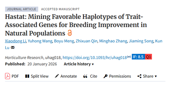 近日,学院油菜分子育种团队在Horticulture Research上在线发表了题为“Hastat: Mining Favorable Haplotypes of Trait-Associated Genes for Breeding Improvement in Natural Populations”的研究论文,该研究开发了一款基于Python语言的综合性基因优异单倍型挖掘工具Hastat (//github.com/swu1019lab/hastat),同时也提供了在线分析平台 (//brassicaibd.cn/analysis/haplotype),将在未来的群体遗传分析和基因组设计育种中发挥重要价值。