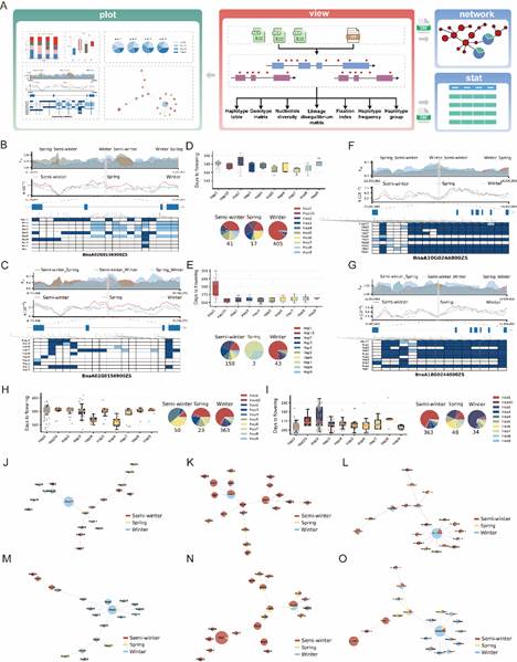 Hastat采用了模块化设计,包含分析(View)、统计(Stat)、网络(Network)和绘图(Plot)四个模块,使用户能够快速获得基因区域的单倍型和选择信号信息的同时,还能进一步完成单倍型网络的深入探索和高质量的可视化输出。为了全方位验证 Hastat 工具的解析能力与稳健性,研究团队整合了来自全球的 1,662 甘蓝型油菜重测序种质资源,利用 DeepVariant 高精度检测并过滤构建了两个大型变异数据集(BnaWGS-1007 BnaWGS-655),并利用Hastat深入解析了两个控制开花时间的关键基因: BnFT.A02BnFLC.A10。在选择机制上,两者展现了截然不同的进化命运,BnFT.A02 区域表现为高核苷酸多样性的平衡选择 (Balancing selection),保留了适应性灵活性;而 BnFLC.A10 则在启动子及编码区检测到了强烈的人工选择信号(Selective Sweep)。进一步的单倍型网络分析重现了油菜从欧洲冬型向中国半冬型及春型生态型驯化的历史轨迹:在这一过程中,以冬型为主的BnFT.A02 晚花单倍型(Hap1,约180天开花)频率逐渐降低;相反,携带自然变异的 BnFLC.A10 早花优异单倍型(Hap1, Hap4, Hap6,约165天开花)在半冬性群体中被显著富集。这一选择过程极大地促进了如中双11等现代半冬型品种的形成,充分展示了Hastat在解析重要性状演化机制中的强大效能。