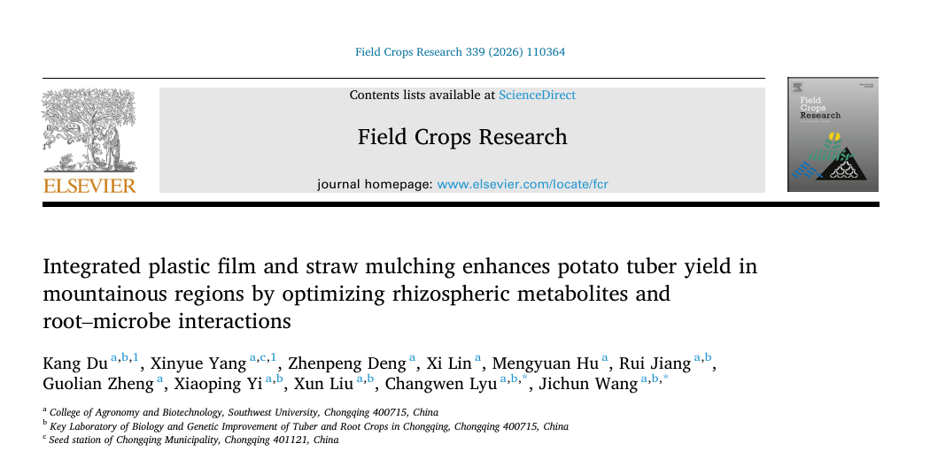 Field Crops Research | 薯类团队揭示地膜与秸秆覆盖能优化根际代谢产物并改善根系-微生物互作关系,从而提升山地马铃薯块茎产量,该研究系统阐释了其背后的生理与微生态机制