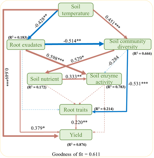 3 PLS-PM揭示土壤温度变化对根分泌物、土壤群落多样性、土壤养分、酶活性、根部特征以及马铃薯产量的影响