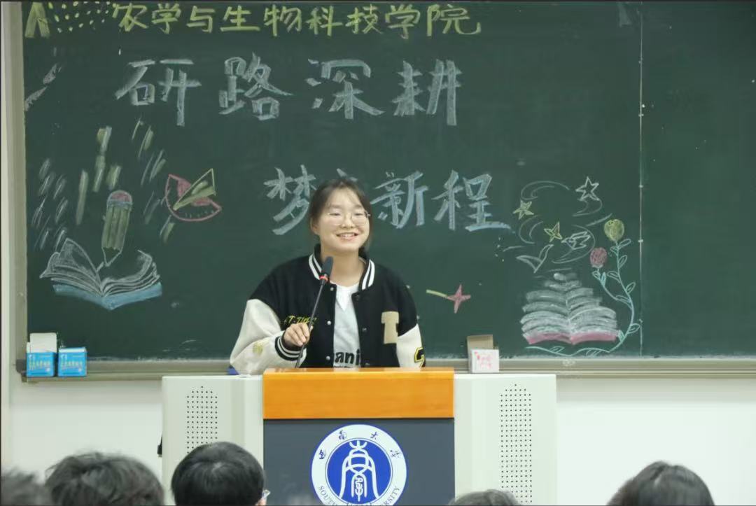 最后一位分享嘉宾是 2022 级植物科学与技术专业的吕林峰同学,现已推免至清华大学北大清华生命科学联合中心(CLS)直接攻读博士学位。分享会上,他首先解读保研圈内用语、分析当前保研整体状况。他强调:“进入面试即站在同一起跑线,结果仅由面试表现决定。”他从专业知识、导师研究、科研经历三个维度对面试环节展开讲解,提醒同学们应研读专业核心课程知识,提前查阅心仪导师的论文、项目成果,深入梳理自己的科研项目,清晰阐述研究思路与实验方法,确保在面试中能够从容应答。最后,他将自身经历凝练为一句箴言:“面对得失,既要敢于勇攀高峰,也要学会适时取舍,以豁达从容的心态迎接人生挑战。”