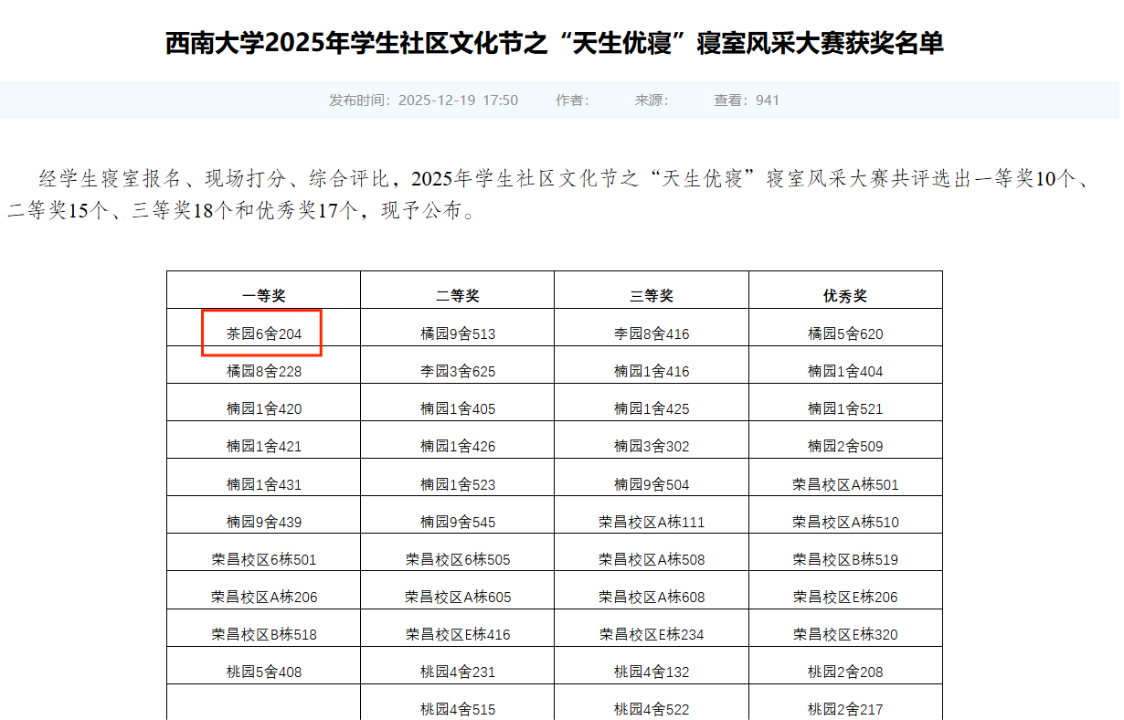 西南大学2025年学生社区文化节之“天生优寝”寝室风采大赛结果近日揭晓,南宫28